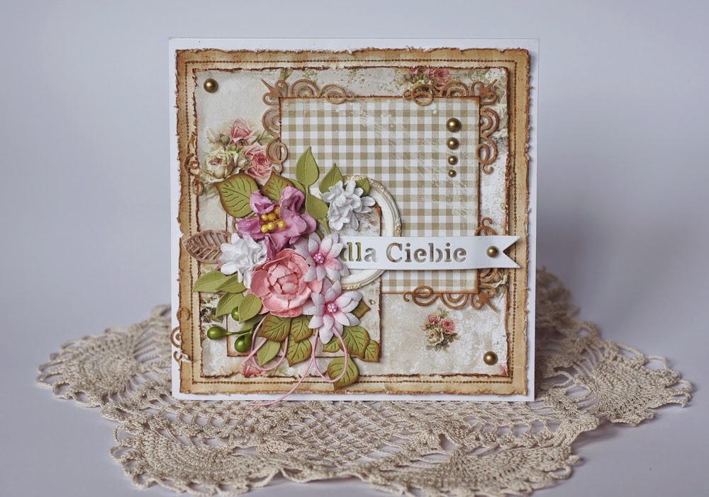 Tekturka ze Scrapińca, papiery to Sklepy Cynamonowe UHK, ScrapBerry's. Serduszko kolorowane mgiełką 13 Arts, miejscami, co widać na zbliżeniu lekko muśnięte werniksem metalicznym. Wykrojniki Crafty Ann, Memory Box, kwiatki moje i kupowane...